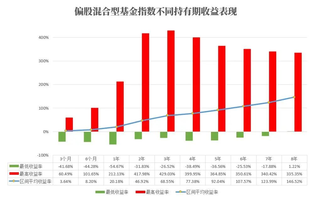 除了提升正收益的概率,我們投資基金自然也希望獲得更好的收益體驗(yàn)。我們?nèi)砸云苫旌闲突鹬笖?shù)(Wind代碼:885001.WI)為例,統(tǒng)計(jì)從指數(shù)設(shè)立開(kāi)始至2022年底近20年的數(shù)據(jù),任意一天內(nèi)買(mǎi)入該指數(shù),分別持有3個(gè)月、6個(gè)月、1年、2年、3年、5年、6年、7年、8年的平均收益率。